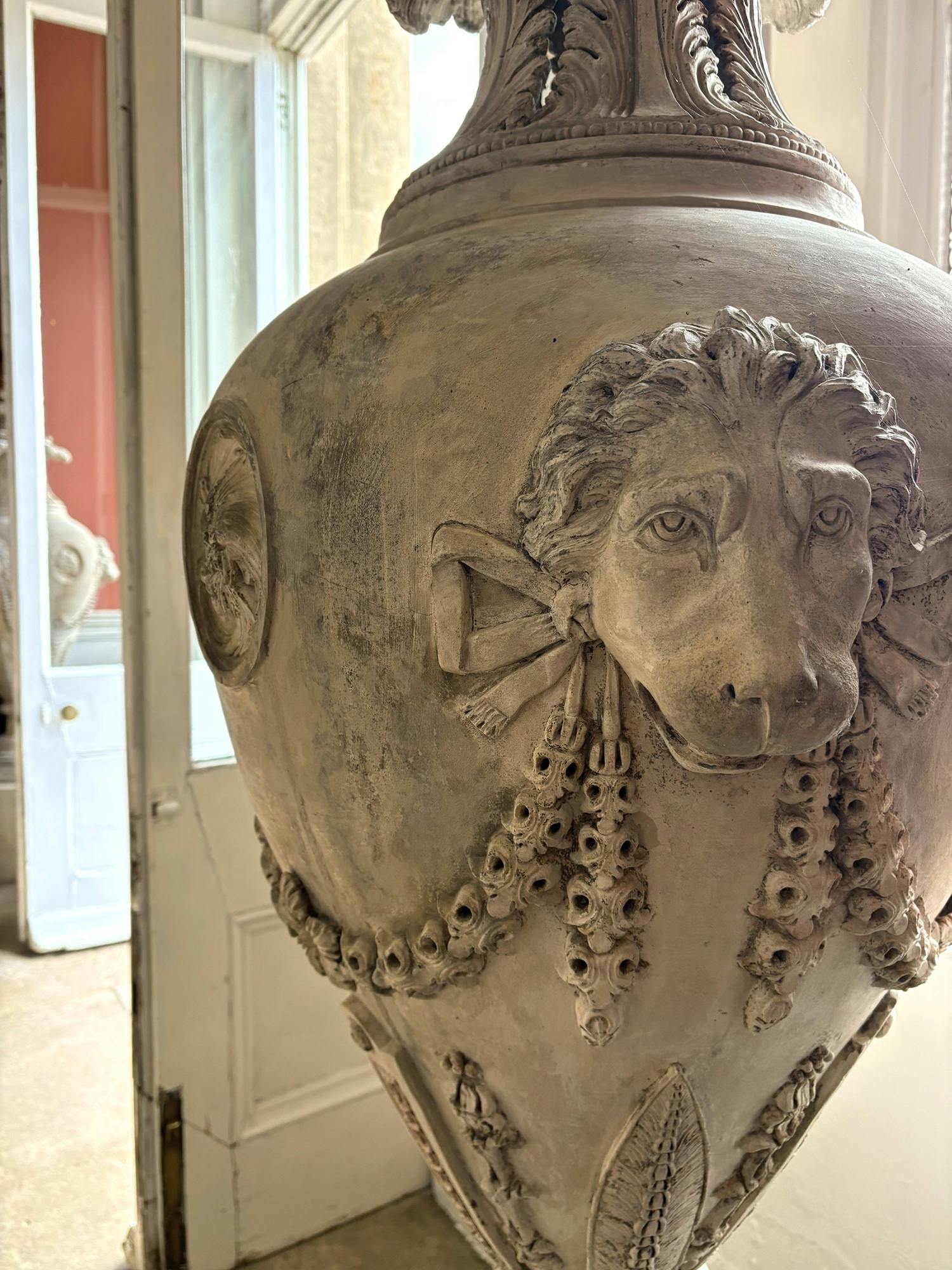 These urns, made of Coade Stone, stand either side of the doors in the Orangery. If you look closely, you’ll find acanthus leaves, lions, bows, botanical details and scrolls. Coade stone is an artificial stone that is incredibly weather-resistant and hard wearing and was very popular for architectural details and decoration – like these urns – during the second half of the eighteenth century into the nineteenth. The stone gets its name from Eleanor Coade, a highly successful businesswoman.