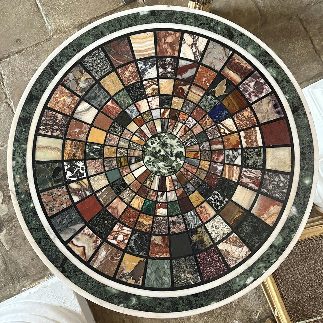 What exactly is a specimen table? It is a decorative object that is made up of numerous different specimen materials. In our case, 170 different samples of marble sit in beautiful rings on this Italian tabletop, showing different veins and textures, from mottled greens to bright yellows, rich reds to a deep blue.